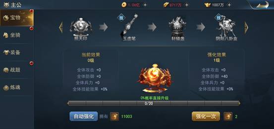 点击界面下方的强化按钮,可进行宝物强化。强化宝物需消耗铜雀令,每成功强化一次均会提升强化进度。强化进度每达成一个刻度,即可获得属性提升。