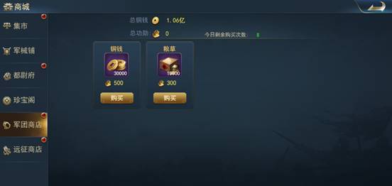 在军团商城中可消耗功勋购买铜钱或粮草,需注意的是商城中每日购买次数有限,且粮草和铜钱共享购买次数。升级军团即可提升购买次数上限。
