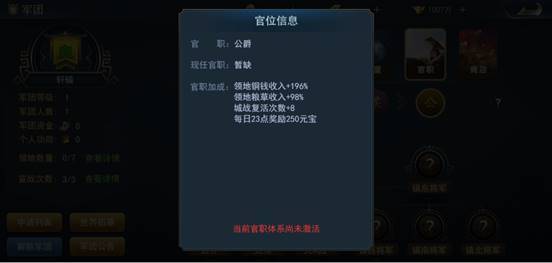 军团占领都城之后即可激活对应体系的官职,担任官员虽不能直接获取铜钱,但官员会提升大量封地铜钱产出量。