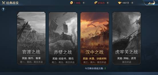 经典战役在每周一、周四、周日时开启官渡之战,成功挑战关卡后将获得大量铜钱与粮草奖励,机会不容错过。
