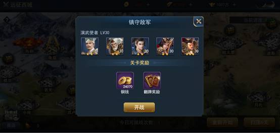 35级开放远征西域,共有15个关卡可供挑战,每个关卡可挑战一次。成功通关每个关卡均可获得不菲的铜钱奖励,每3关还可开启1个宝箱,获取更丰厚的奖励。