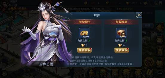 在府库中可征收铜钱与粮草,每成功收复一个城池,即可获得1次免费征收的次数,征收时还有一定几率使获得的资源翻2-3倍。免费征收次数耗尽之后,还可以消耗元宝进行征收。值得注意的是,游戏中会在固定的日期开放府库双倍活动,此时征收可获得双倍资源。
