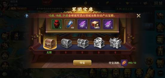 军团宝库会根据军团占领城池数量及规模产出各类宝箱,使用令箭即可进行夺宝,宝箱中会产出大量铜钱及粮草。
