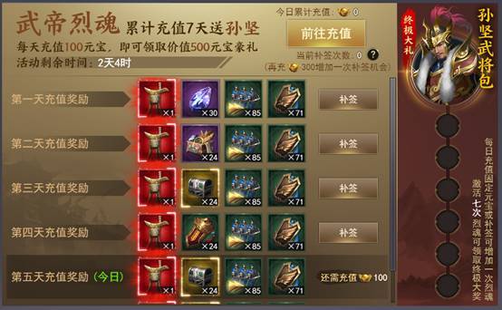 活动期间未充值达到100元宝的天数均可补签(当天充值每多300元宝可补签1次)