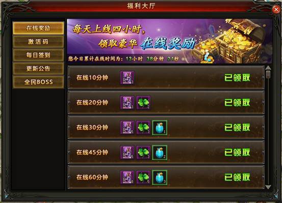 每日在线时间长的玩家,可以领取递增的魔石卡、幻化幸运草、奇异O兽蛋!