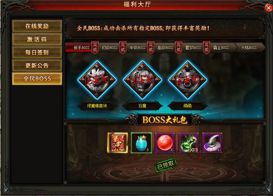 通过击杀野外对应等级的BOSS就可以领取阶段性的BOSS大礼包!里面有丰厚的魔石卡、奇异O兽蛋、皇冠宝珠、经验药水、装备奖励!击杀等级越高BOSS,礼包礼品就越豪华!