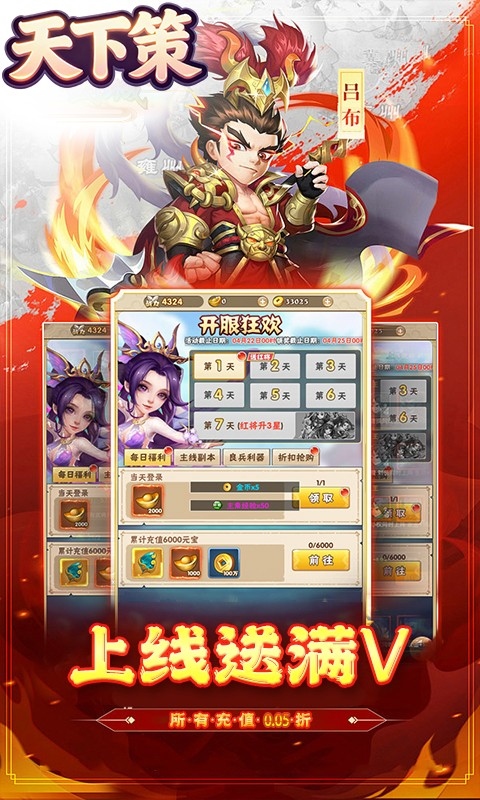 《天下策(0.1折小小三国)》是一款三国卡牌放置手游!置身烽火连天的三国乱世,策略收集名将,组建你的无敌军团。轻松放置即可培养武将,告别爆肝!游戏主打超低0.1折充值福利,大幅降低养成门槛,让所有玩家都能轻松拥有顶级阵容,畅享激烈酣战!